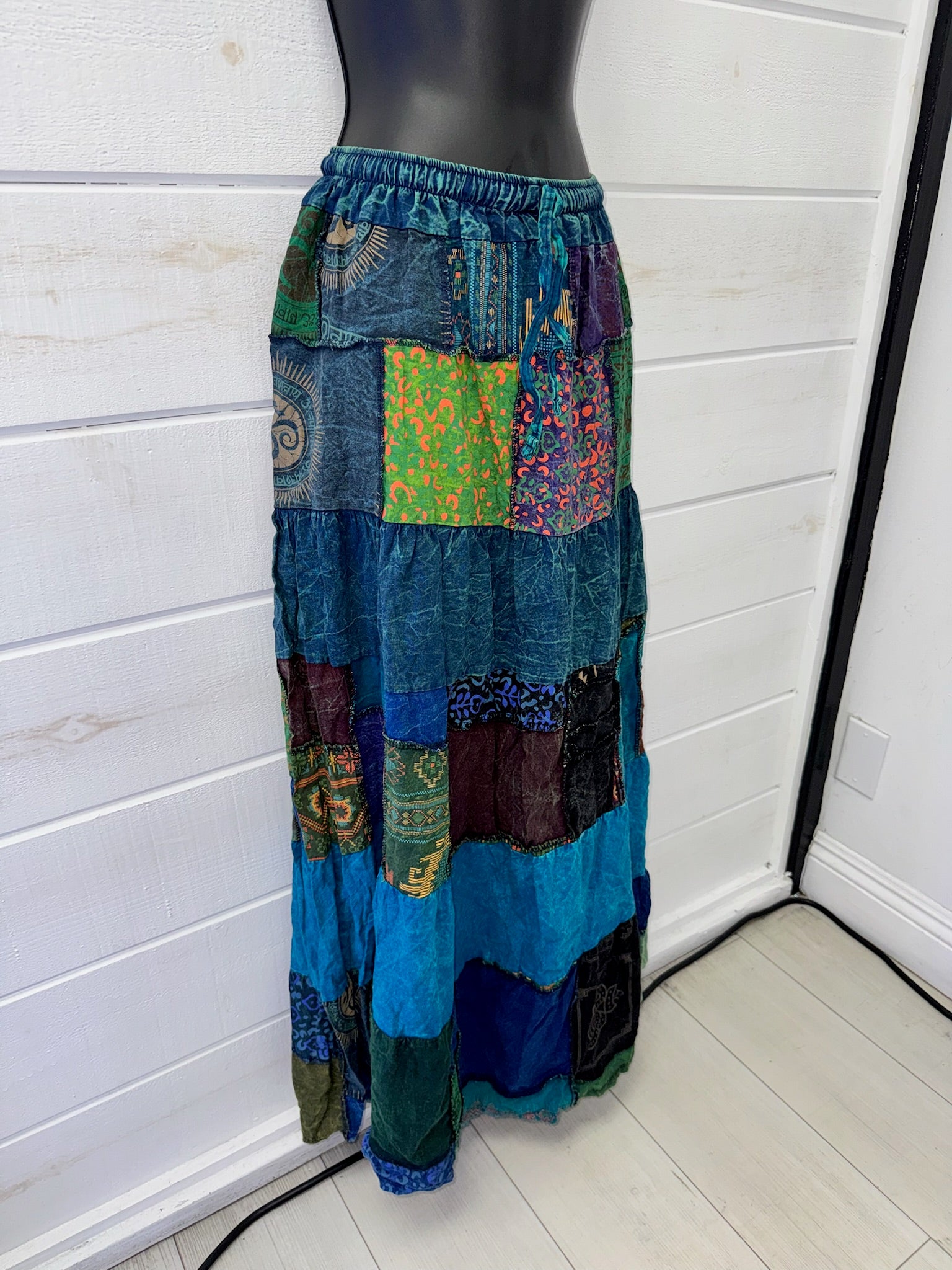 Each Thai Express Blue Patchwork Maxi Skirt is ethically handmade in Thailand using patchwork fabrics. Color placement and patterns will vary, making every piece truly unique. These variations are part of the beauty of handmade festival clothing.
